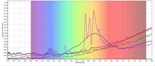 圖3:歸類為LED燈的5個圣誕彩燈樣品的輻照度光譜