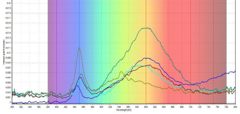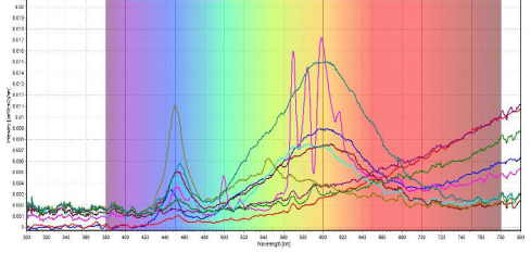 白熾燈樣品在近紅外區域呈指數增長,而LED燈樣品在該區域的斜率接近零。此外,LED燈樣品在可見光范圍內顯示出一些特定波長峰,這歸因于LED燈的特定顏色波長。