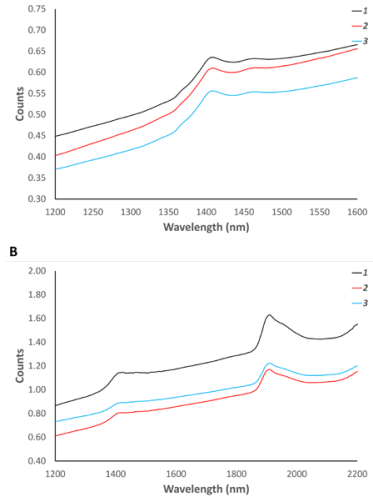 如圖所示,NIR1.7和NIR2.5都檢測到了1400nm附近的水吸收峰。圖A所呈現的吸收峰曲線變化幅度相較于圖B更明顯,這是因為NIR1.7的分辨率更高