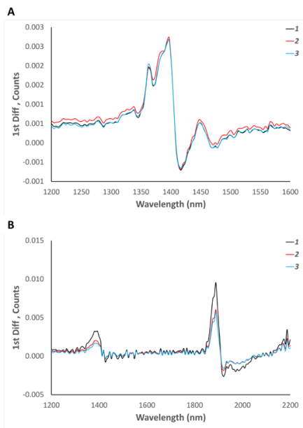 圖2:使用NIR1.7 (圖A)和NIR2.5 (圖B)測量經微分處理后的二氧化硅顆粒(樣品1、2、3)的光譜圖