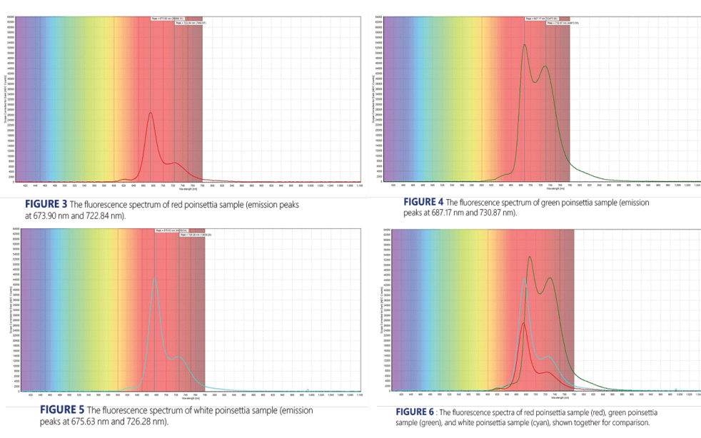 綠色一品紅葉片樣品的熒光光譜在687.17 nm和730.87 nm處顯示更高的發射峰。與紅色葉片樣品相比,這兩個峰略高,但仍與文獻報道所描述的葉綠素發射峰一致。