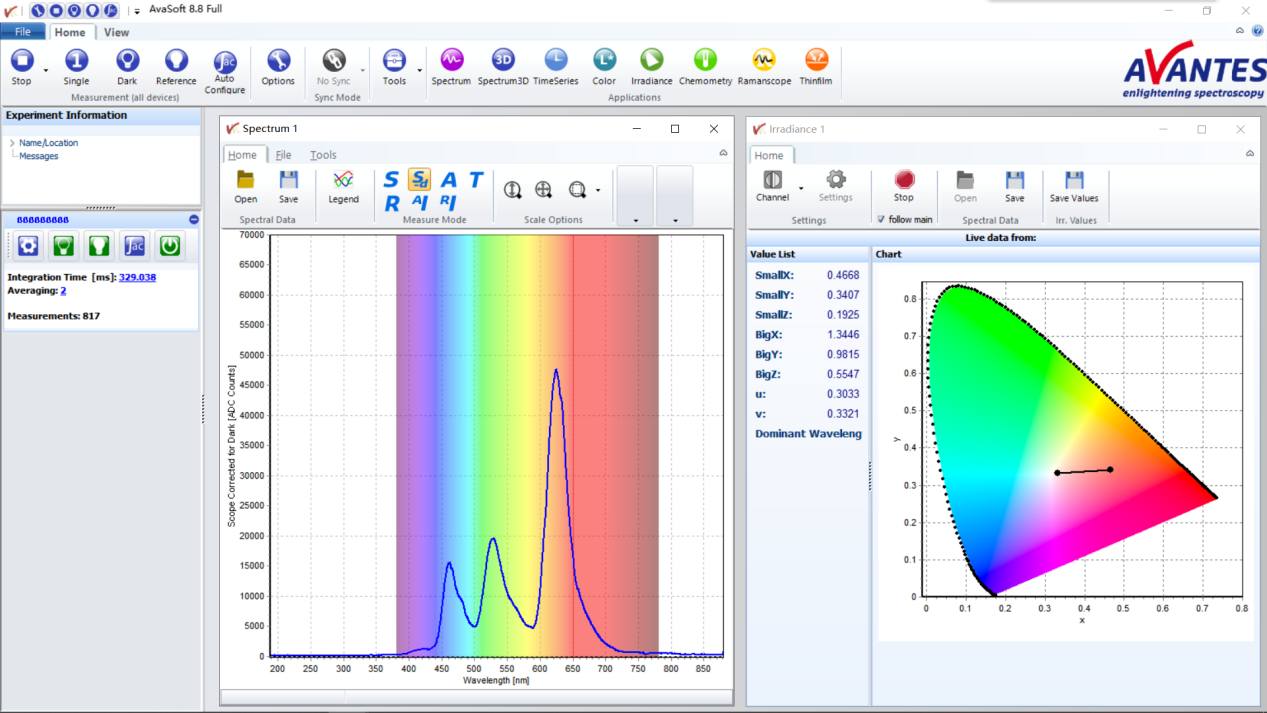 整個系統用NIST可溯源標準光源在特定的波長范圍做特定的輻射定標(μW/cm2/nm),定標后的系統可用AvaSoft-IRRAD軟件來測量并得到以下參數:X, Y, Z, x, y, z, u, v, CRI、色溫、主波長、補色主波長、半高寬、峰值波長、色差ΔE等。此外,原始數據和色坐標也可以顯示??蛻艨捎肁vantes提供的動態鏈接庫(DLL)可通過C#、C++及其他的編譯環境進行二次開發。