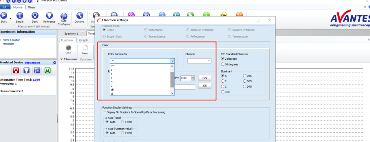 在AvaSoft-FULL軟件中的歷史通道功能,使我們可以很方便的監視L*a*b值、XYZ值、色差Δu、Δv、ΔE色差等參數隨時間的變化情況,甚至我們還可以自定義一些參量,并觀察它們隨時間的變化,軟件也可以同時監測多個參數隨時間的變化。